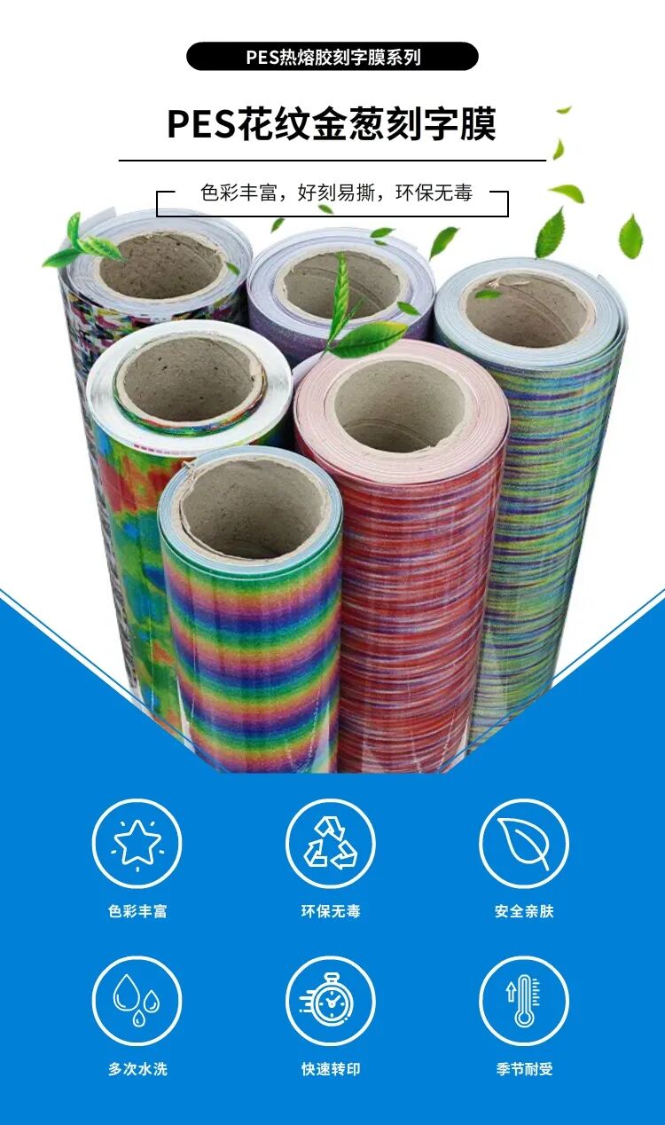 金葱刻字膜产品立体感非常好,金葱粉均匀细致,闪光效果均匀,深受大多数人喜欢。具有闪亮效果,该产品需要与电脑刻字机及烫画机配套使用,非常方便,可由自己的喜好或客户要求选择色彩,以增加承应物的丰富性和变化性,具有优越的洗水色牢度及胶粘牢度,且手感极佳,柔软不开裂,有弹性,时尚环保!