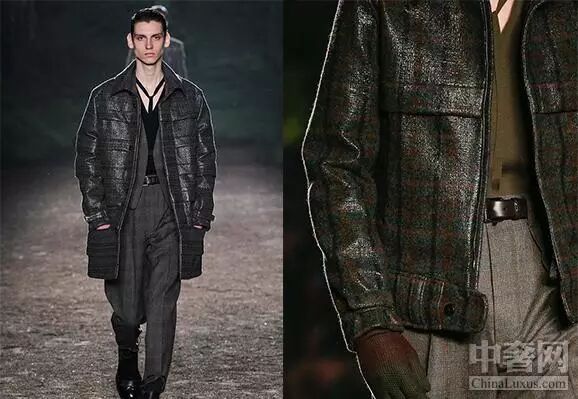 在ZEGNA2015秋冬男装的秀场上,主题定义为“自然”,环保是最大的看点,Stefano Pilati掌舵的这一季把意大利男士正装从花哨喧哗的Pitt Uomo中带离,塑造出清澈且富现代美感的新正装形象。面料上十分考究,这一季的面料是Stefano Pitali从苏格兰找来的拥有数百年手工织造粗花呢的面料品牌,为品牌定制的哈里斯粗花呢(Harris Tweed),并且加入了现代工艺,使得面料如同覆上了反光涂料一般。至于服装款式,和本季米兰男装周的主题保持一致,Stefano Pilati用制服主题贯穿始终,要么是廓形大方的户外大衣,要么是用天鹅绒或者羊毛织物裁制的改良西装。