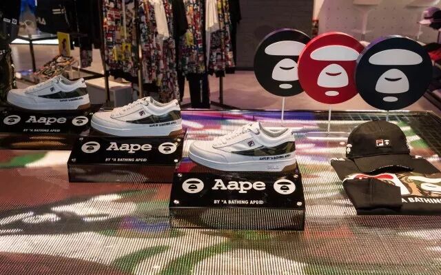 当然这双联名款选择的联名对象 AAPE 则制造了足够的话题性。AAPE 贵为 BAPE的副线,其设计风格和标志性元素均沿袭了 BAPE 的精髓,加上更亲民的定价,使得 AAPE 在街头出现的比例远远大于 BAPE。这也让 AAPE 成为众多品牌选择联名时的“宠儿”。