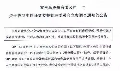 3月22日午间,富贵鸟发布公告,公司于3月21日收到中国证监会《调查通知书》,指出因公司涉嫌信息披露和债券募集资金使用违法违规,根据有关规定,决定对公司进行立案调查。